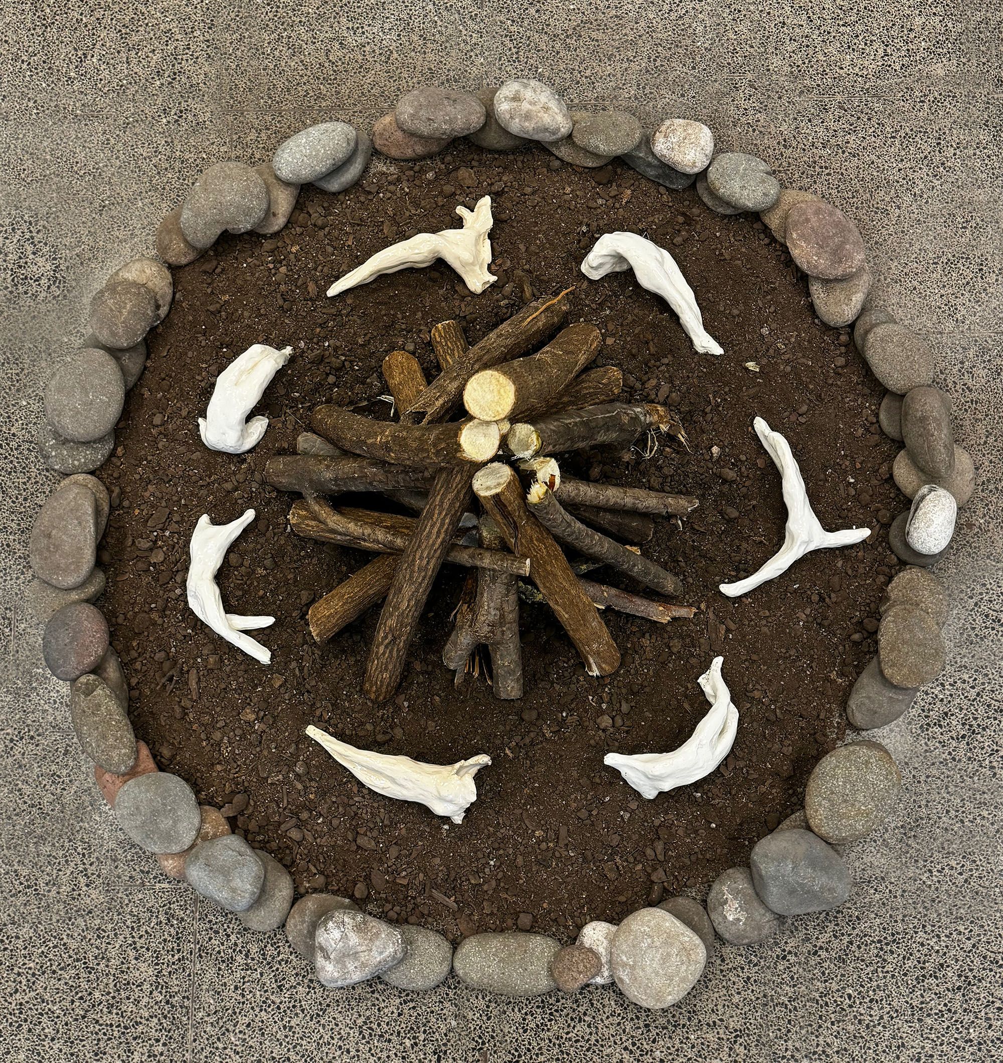 A bonfire of sawn branches. A ritual round of women. A circle of stones. The earth that overflows. Earth, branches, medicinal herbs, and ceramic pieces as symbols of a society disconnected from nature—one that harms what it creates.