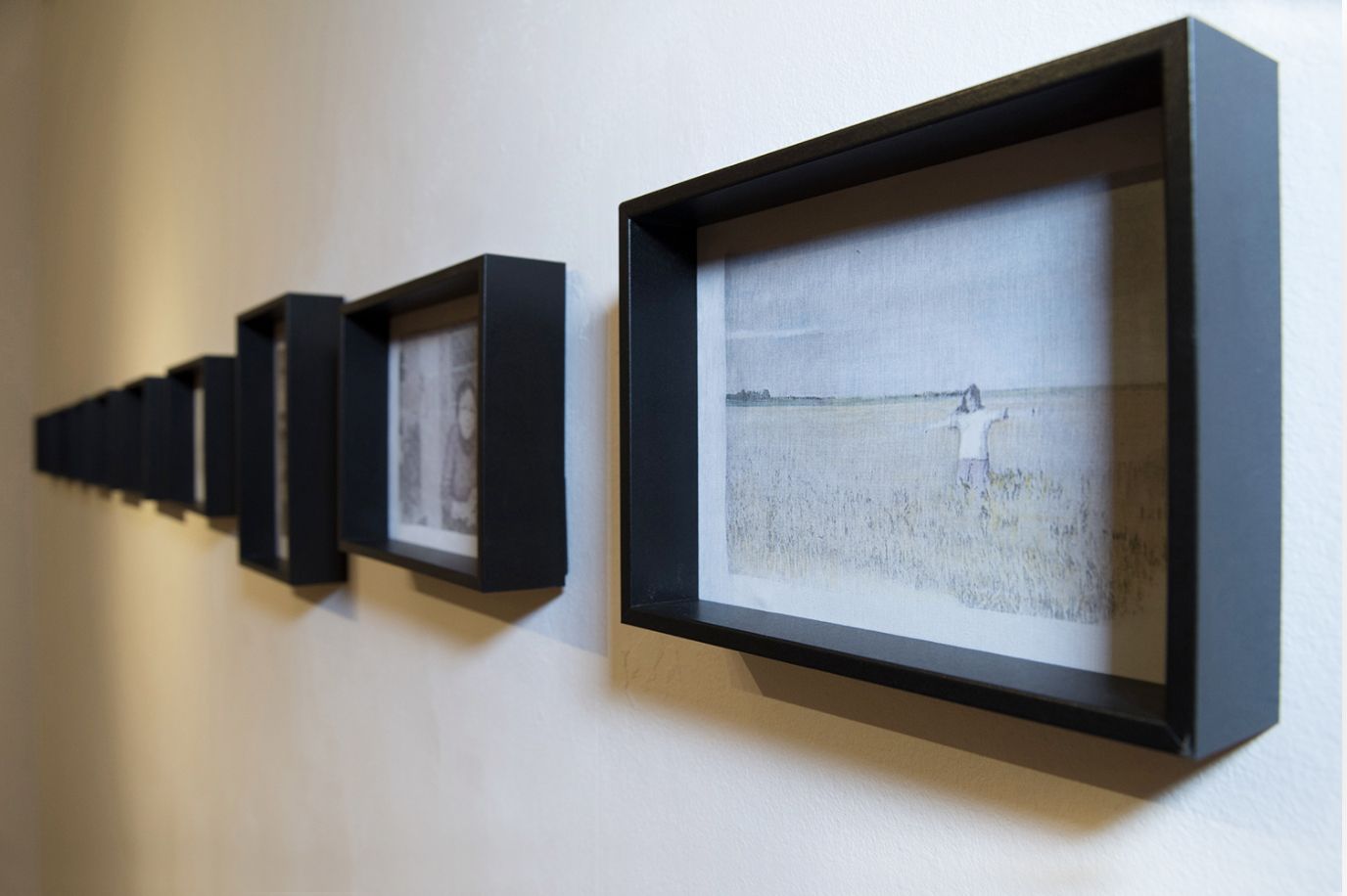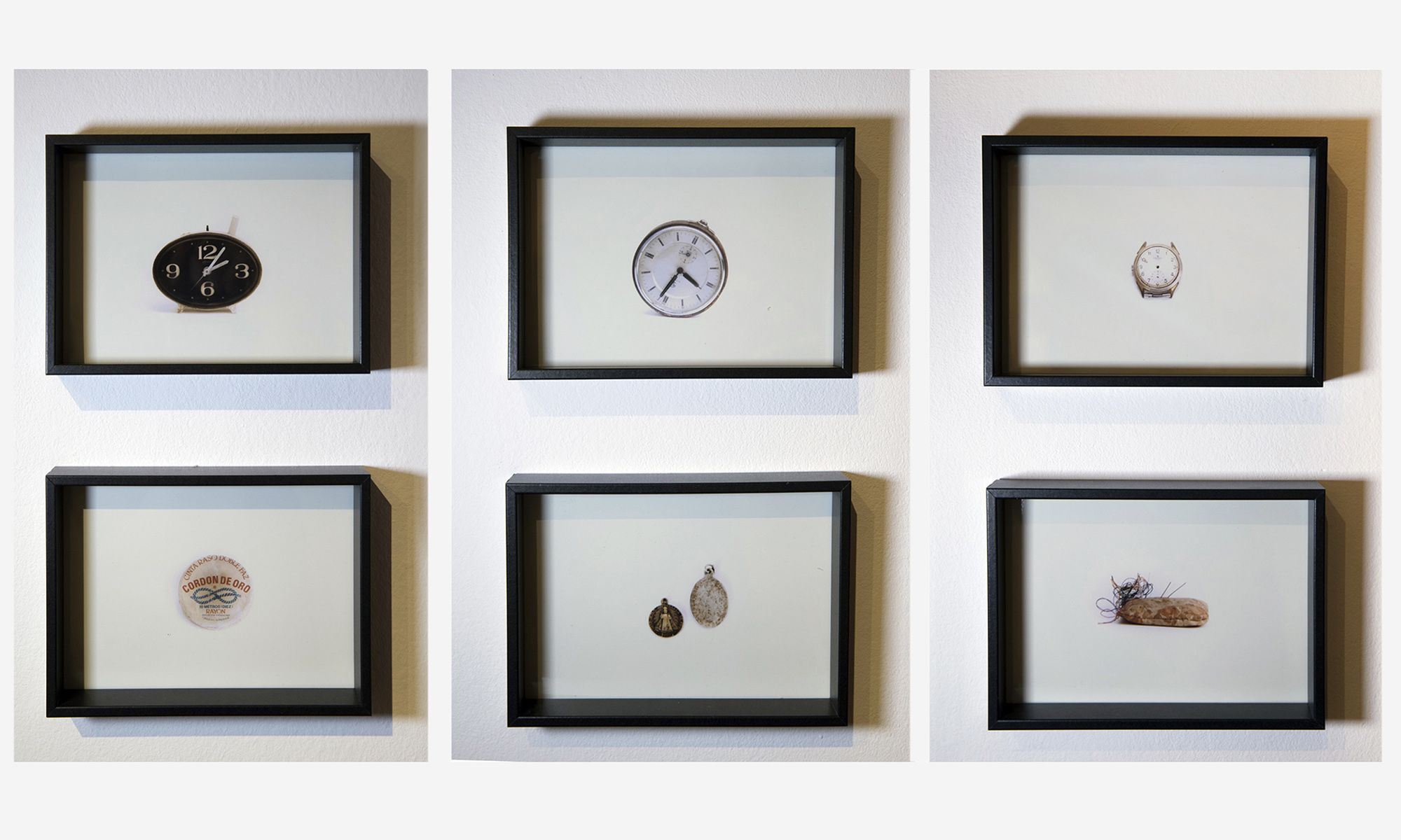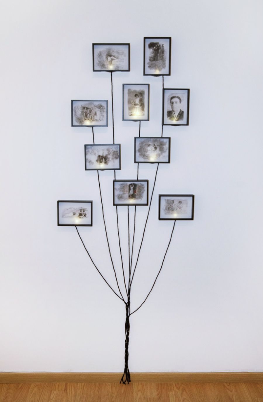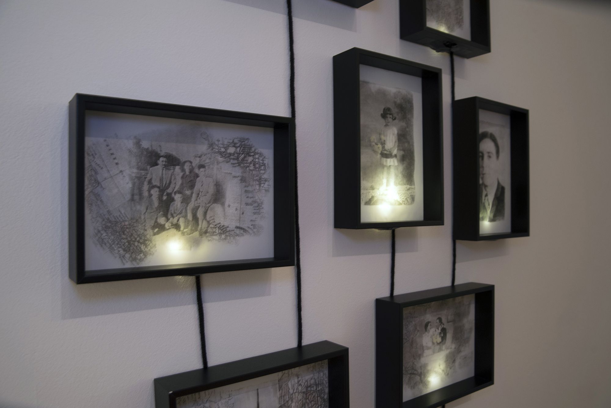 Transfers, bordados, un árbol genealógico con cajas de luz, ramas cosidas con hilos rojos y un mar que subvierte el tiempo.